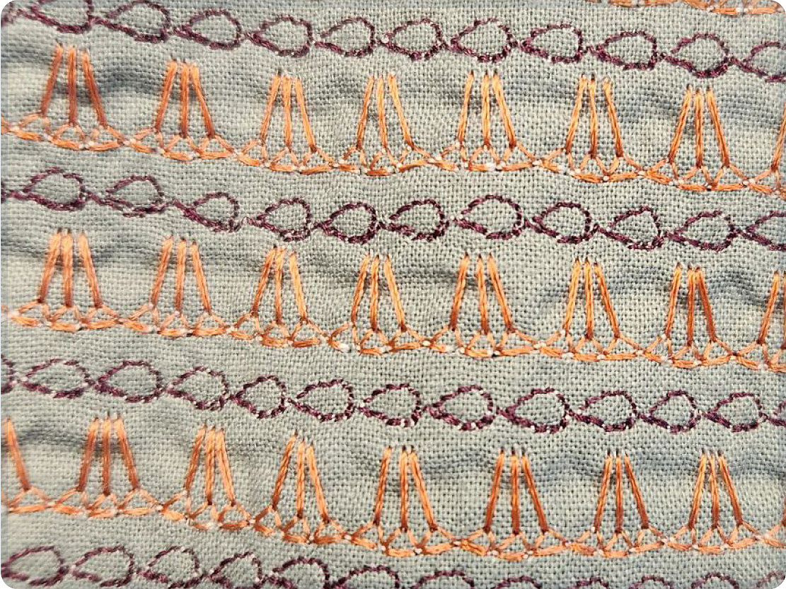 Use Mirage Stitches to add an interesting design element to your project. These unique stitches offer a satin look in a variety of shapes with spaces between each motif, making the stitches appear to float on the fabric! Janome Mirage Stitches are infinitely customizable with separate tension and stitch length settings for both the hidden connecting jump stitches and the main satin stitch. This effect can be used on either one or two pieces of fabric.