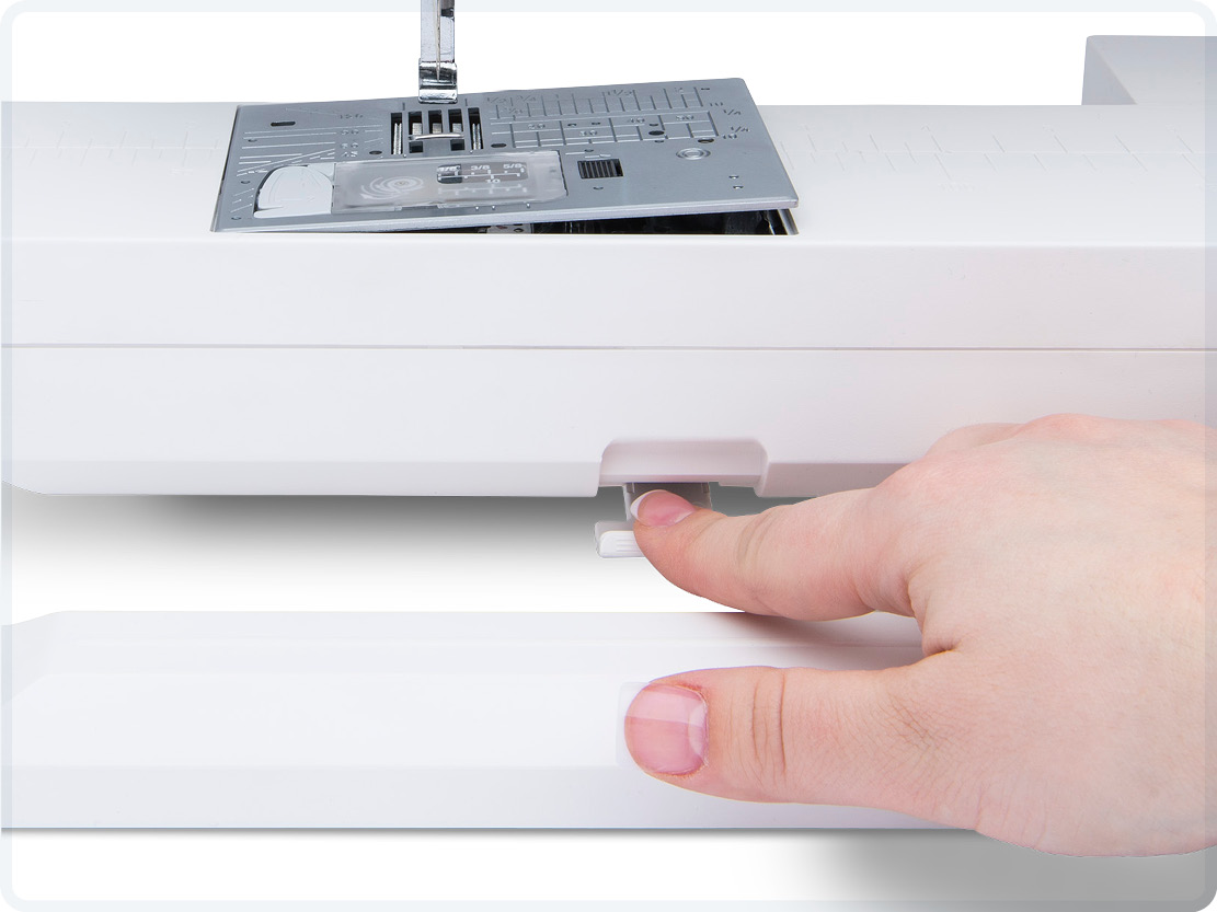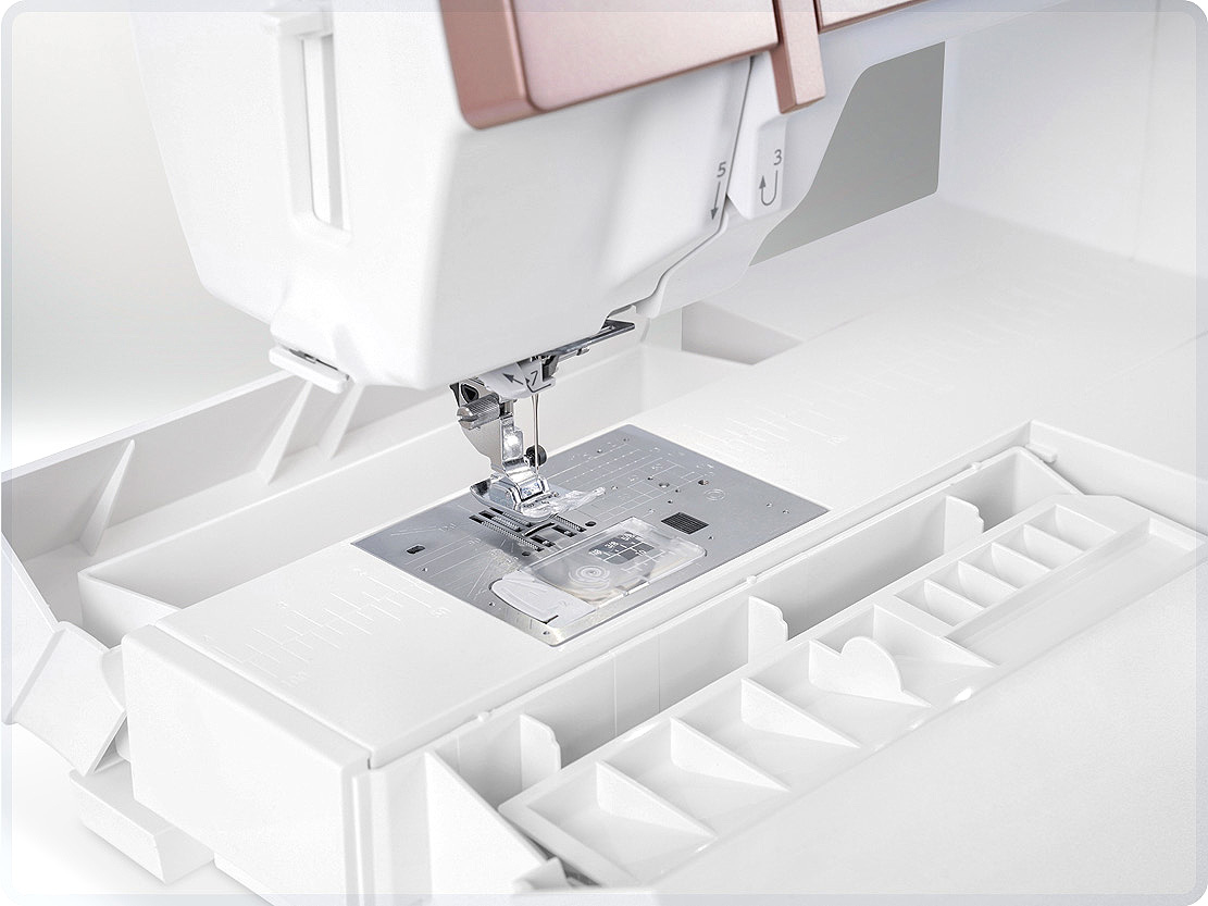 Utilize the double accessory bins plus upper storage on the machine. There are specially designed trays for holding presser feet, bobbins, needles and more.