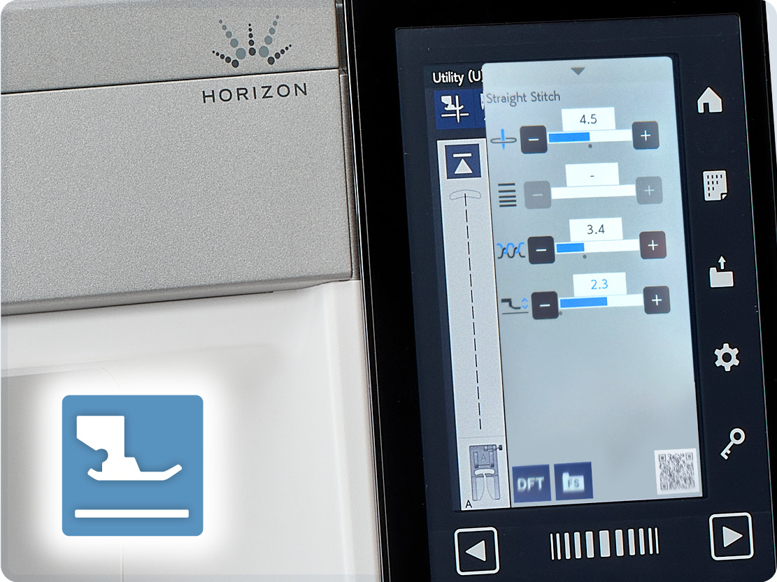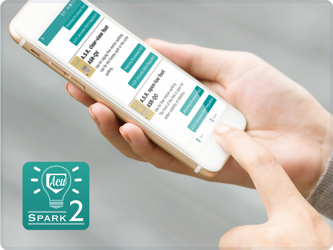 AcuSpark2 App provides machine learning & support. Simply scan the QR code on the screen of your machine with the app to see information about the stitch, recommended presser feet, adjustment tips, and more. *not available on MC9410*