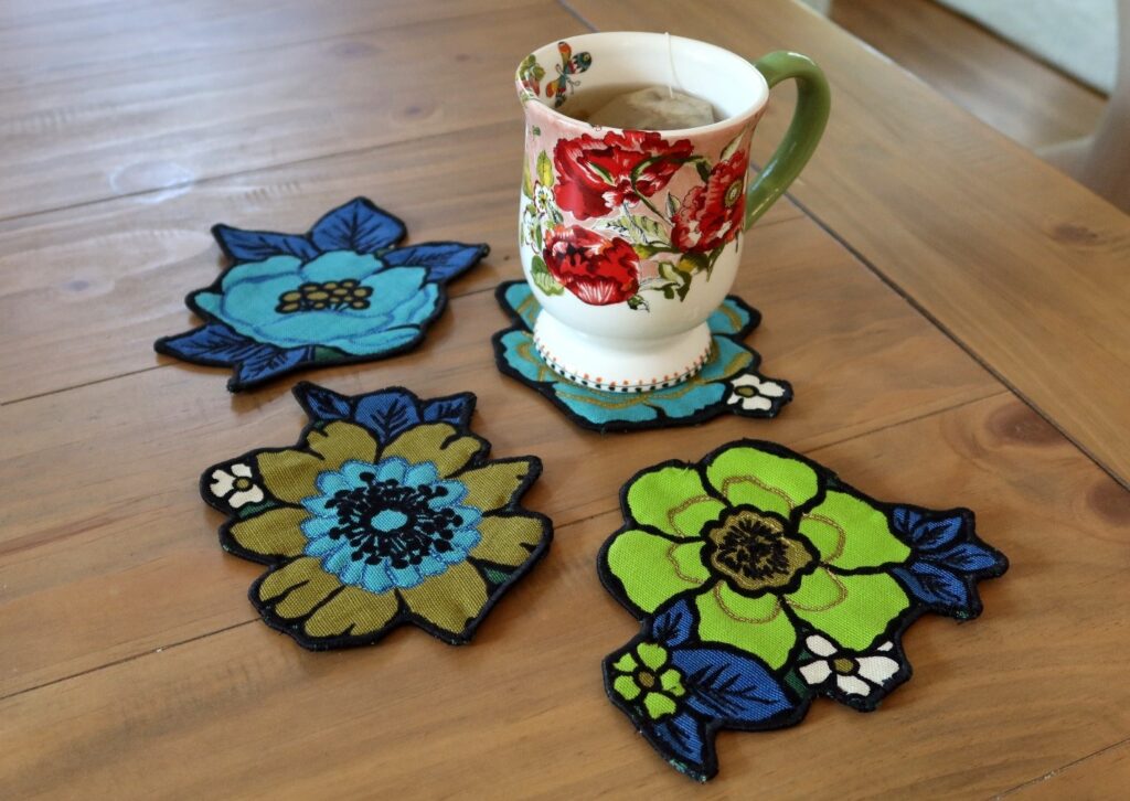 Have you ever come across a beautiful large print fabric that you wanted to see every day? That’s how I felt when I first saw this fabric! After some project planning (and drinking many cups of tea), it dawned on me that these flowers could perfectly fit my tea cup! With some cutting, a little sewing, and a bit of detailed stitching, these coasters sit happily in my sewing space! Below are steps to create your own coasters!