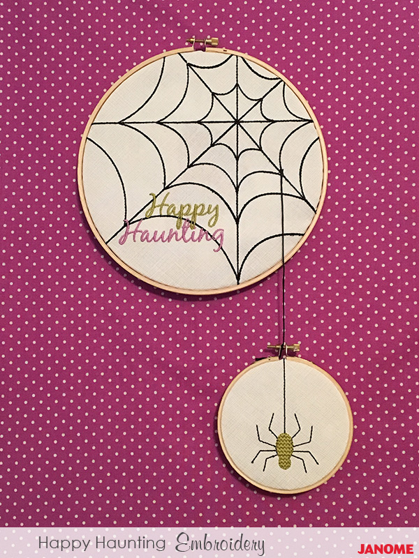 Stitch out each design on the same background fabric, hoop the web in an 8″ wooden embroidery frame, the spider in a 4″ wooden embroidery frame, and connect the two with black embroidery floss. Hang, and enjoy!