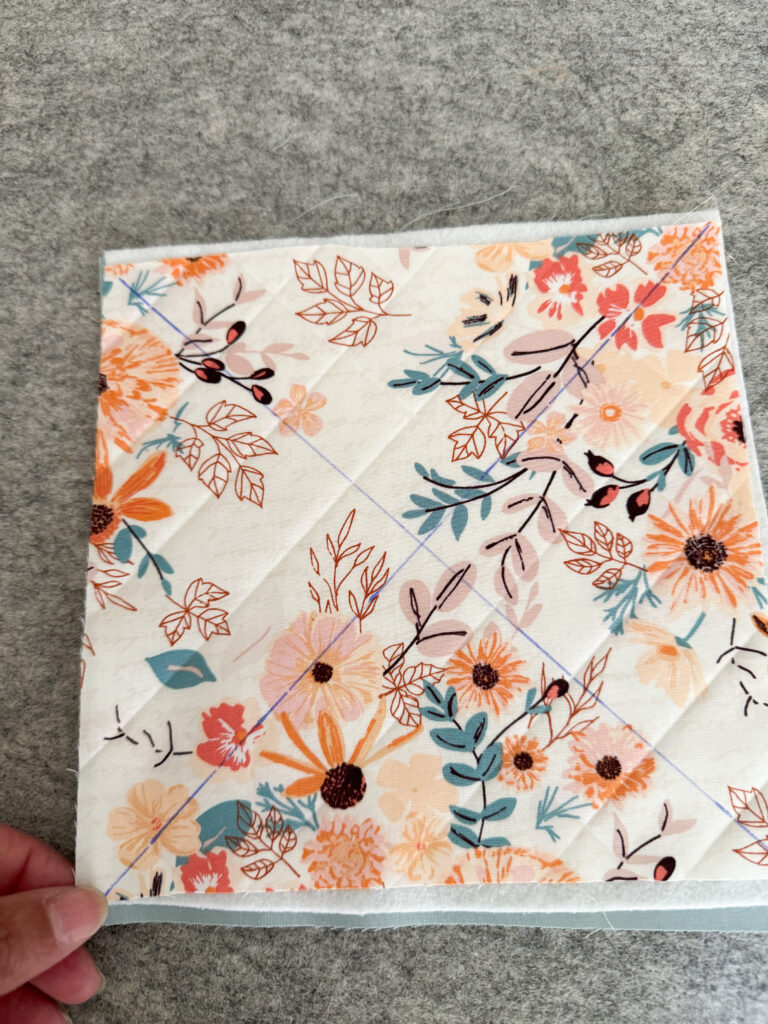 - Take your quilt sandwich to the machine and quilt on all the lines except the center “X” (marked in heat erasable pen in this photo).