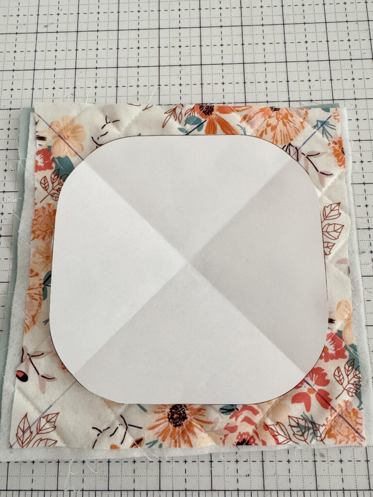 - Using the template, trace and cut the quilt sandwich and then the grippy shelf liner. I creased the template just to make sure it would be centered on my “X” quilting lines.