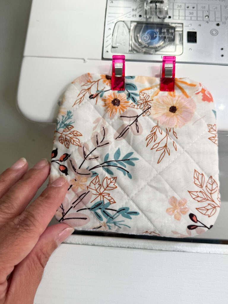 These quilted jar openers are a great little project for your scraps. They measure 5.5” square when finished, but you can always increase the size if you prefer a bigger jar opener. Just make sure to increase your starting fabrics by 1.5”-2” all around so you have room to quilt the fabrics.