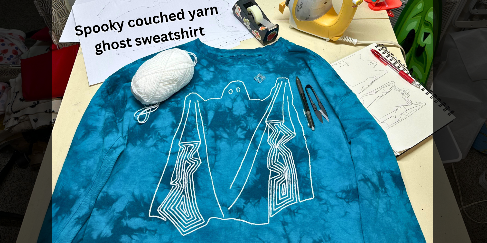 The trickiest part of sewing the thread down was turning tight corners as the yarn wanted to pop out from the foot channel. I solved this by raising the foot, rotating everything together, lowering the foot and then continuing on. This got faster as I progressed through the design. This whole ghost took me about 1.5hrs to complete. The eyes were done with pre cut small lengths of yarn and I layered the ends on top to make them extra secure.