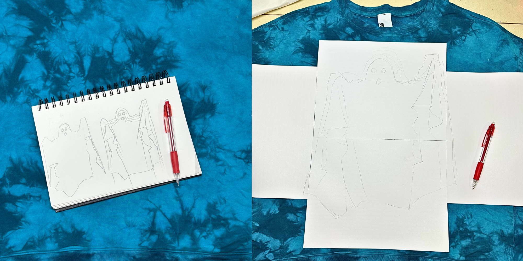 I wanted something a little more sporty and modern than the classic sweater so I grabbed this super soft crew neck sweatshirt from Target. I began by sketching the ghost, taking inspiration from photos and a sheet I tossed on my mannequin. Once I was happy with the look of him, I redrew him to scale on printer paper.