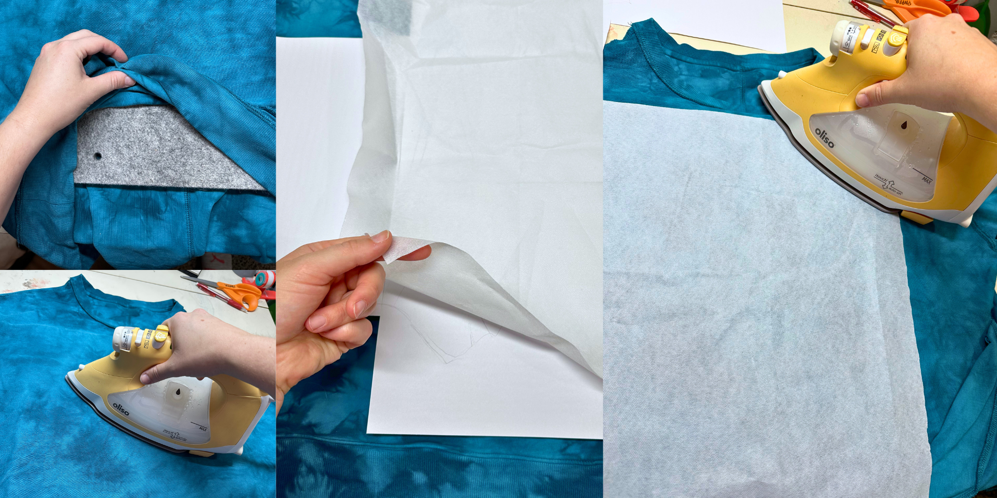Because of the lightness of the fabric, I added some medium-weight fusible interfacing on the inside of the sweatshirt. I flipped the sweatshirt inside out, inserted an ironing pad inside and ironed the fabric smooth. To place it in the right position, I laid the drawing in place and cut out a piece of interfacing that was slightly larger than the drawing. Because of the position of the ironing pad, I knew where to put the interfacing.
