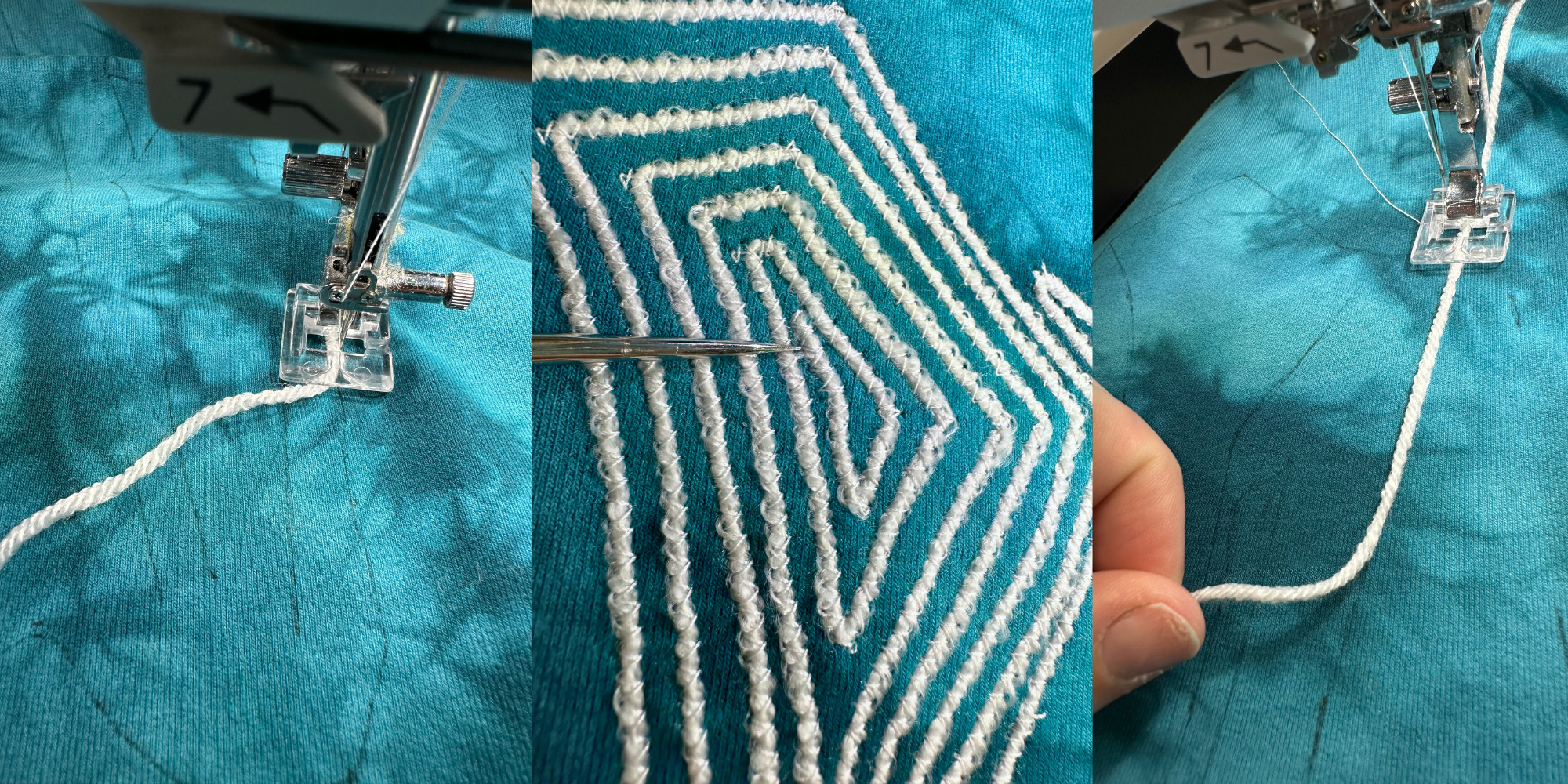 Once the design was thoroughly marked, I removed the paper and connected the marks to form the full design. I set up my machine by attaching the Beading Foot, threading the spool and bobbin with white thread and setting the stitch to middle zig zag. I also pulled up the bobbin thread. You want to make the zig zags only a little bit wider than your yarn so the stitching doesn’t show.