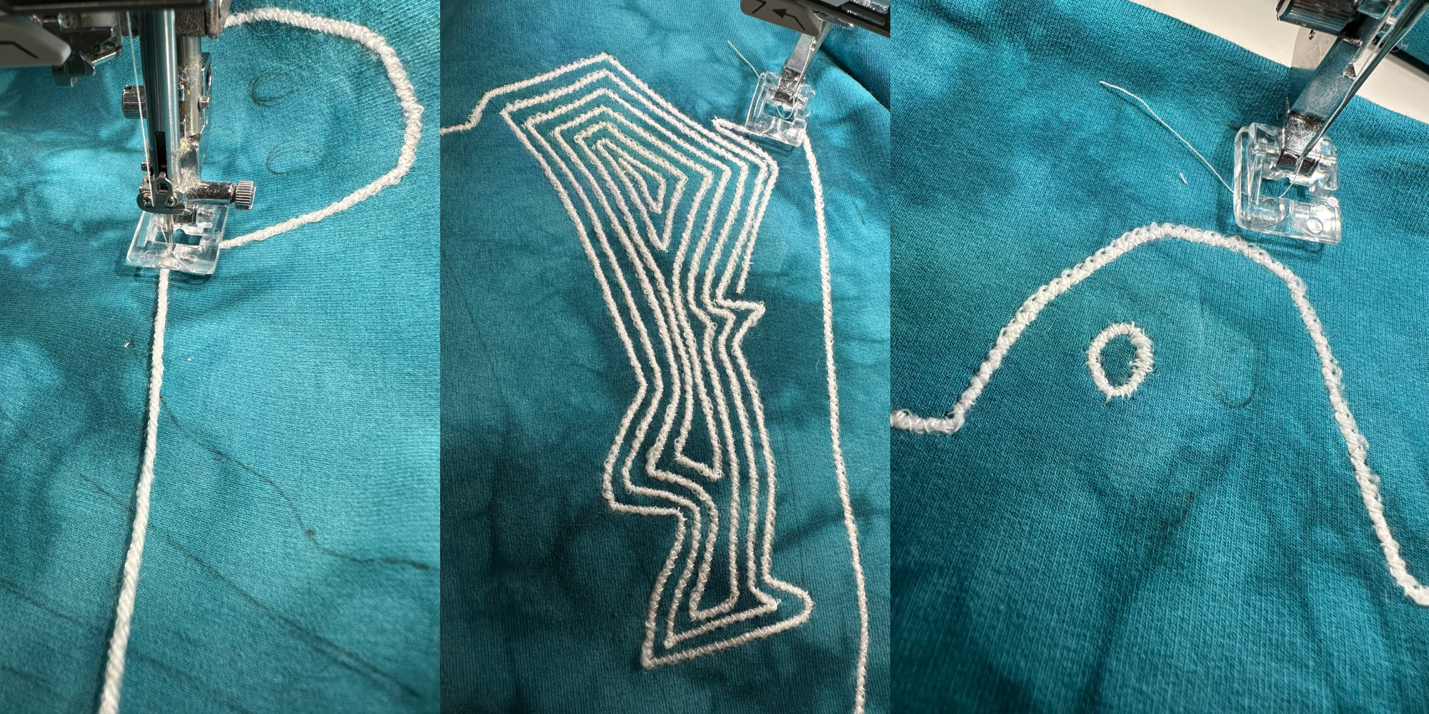 After the machine was ready and the sweatshirt was in position under the foot, I pulled the yarn under the foot. I secured the yarn with a few backstitches and then it was just a matter of following the drawn lines while keeping the thread fed through. At this point I had decided to try and add the yarn in as few segments as possible and to fill in the openings of the “sleeves” with continuous lines.