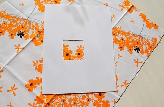 - Next “fussy cut” the pieces needed for the heart’s top and bottom points. To help find the perfect spots in the print, cut a 2 ½” square hole in the center of a piece of card stock. Use the paper to help find perfect pieces for points.