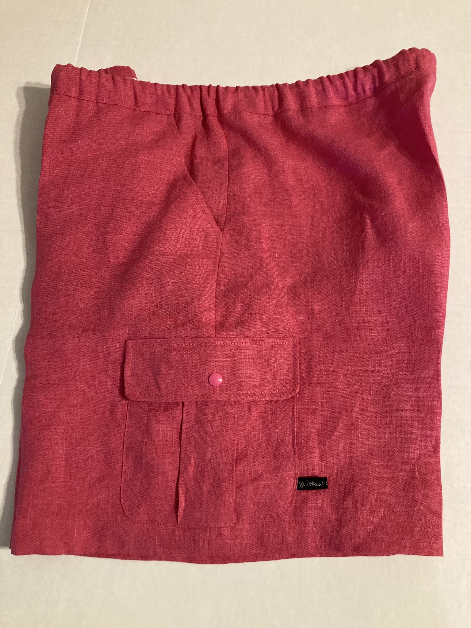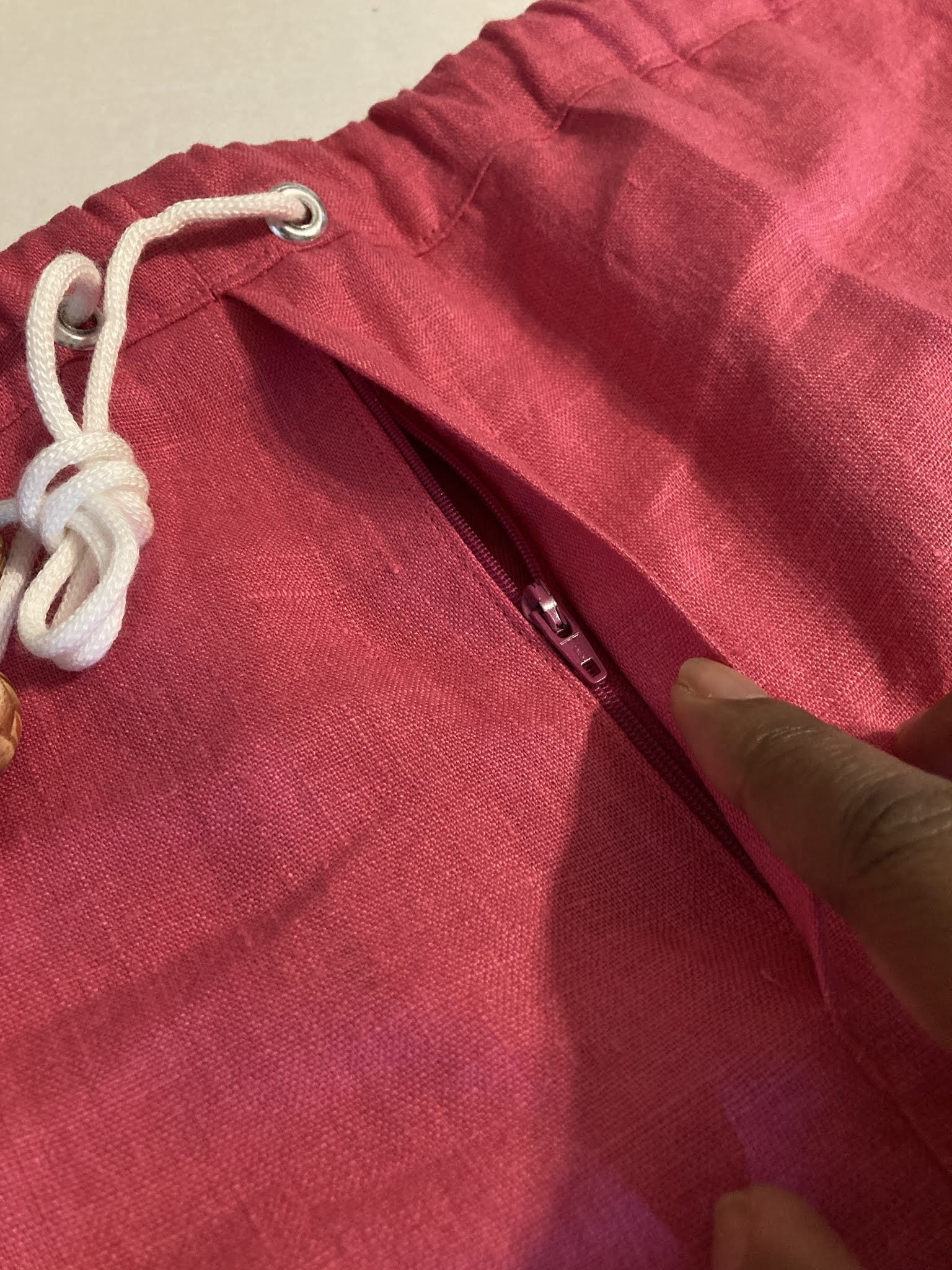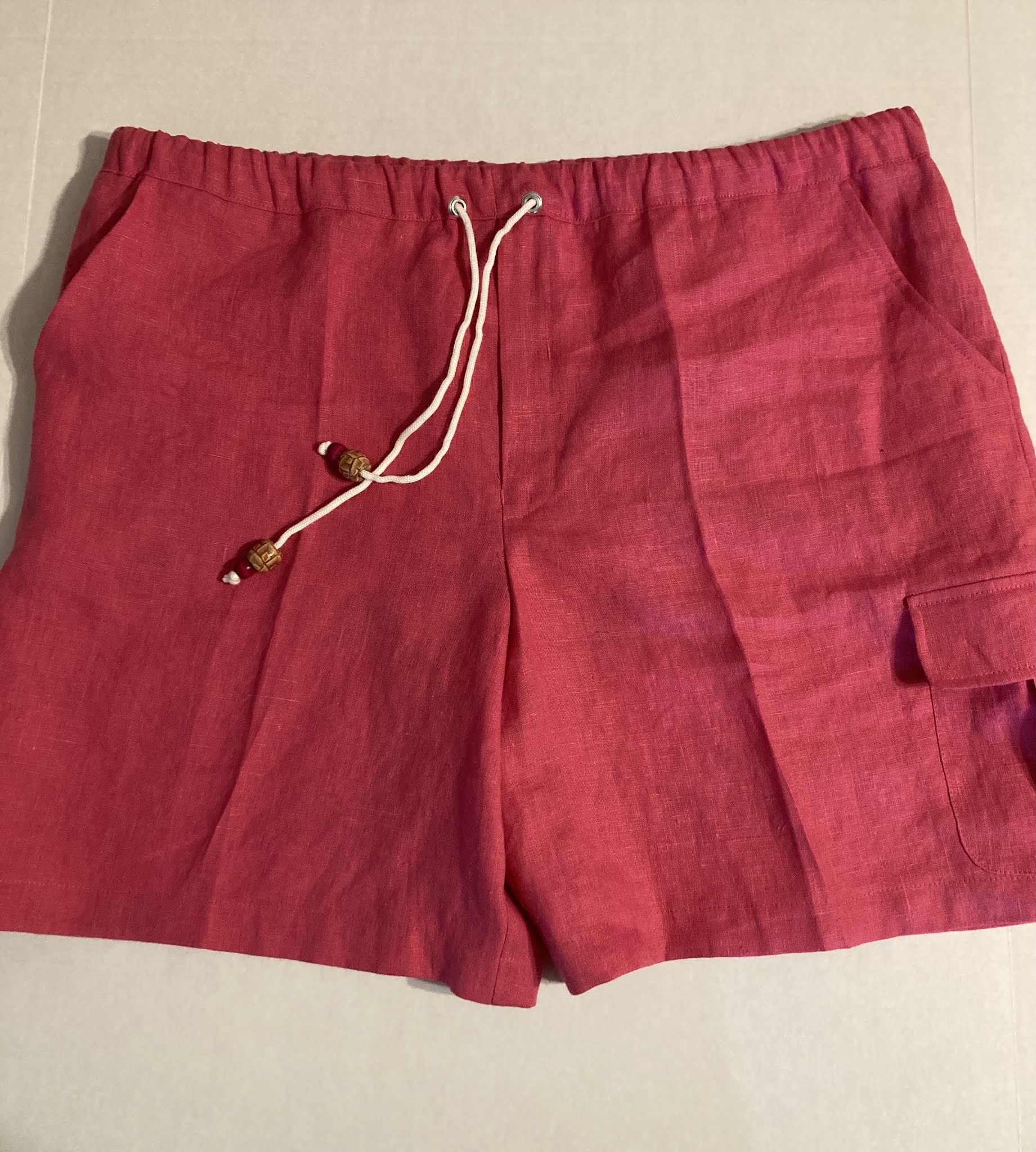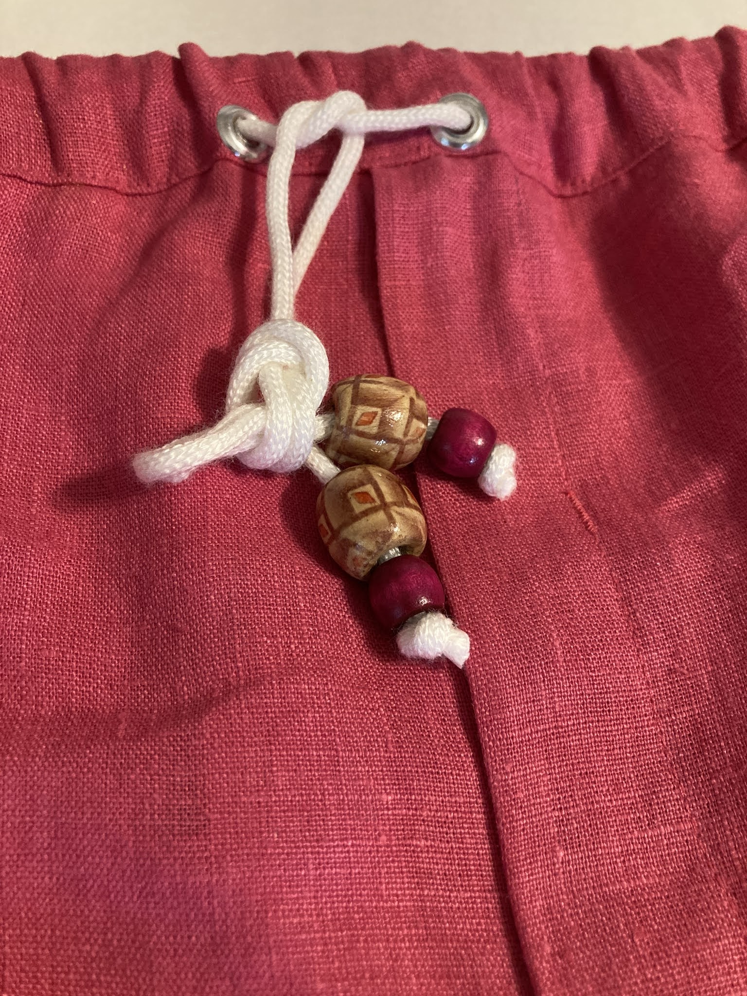 I used the Airthread 2000D to serge the fussy linen edges. I also had fuchsia serger threads to make pretty insides. I made sure I lined the inside of the shorts to minimize the wrinkle factor. They have elastic at the waist, fly zip, and wooden beads to finish off the shorts.