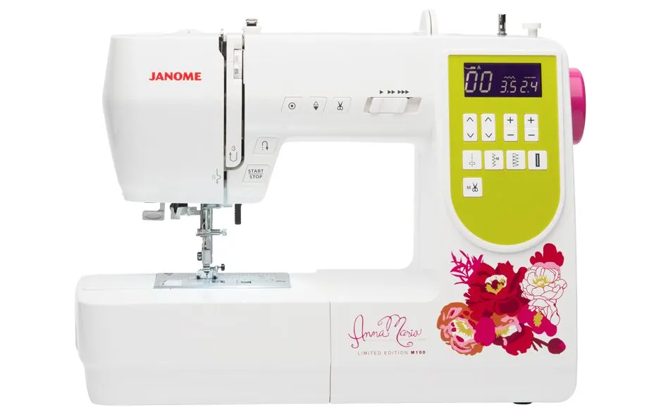 Designed by Janome’s Spokesperson Anna Maria Horner, the AMH M100 is a beautiful answer for the maker who wants to create custom garments and home decor. The AMH M100 includes all of Anna Maria’s favorite features and accessories for her everyday garment sewing, patchwork and quilt making. It has a wonderful selection of 100 built-in stitches and includes cutting edge, easy convenience features that give you an essential variety for your diverse sewing needs.