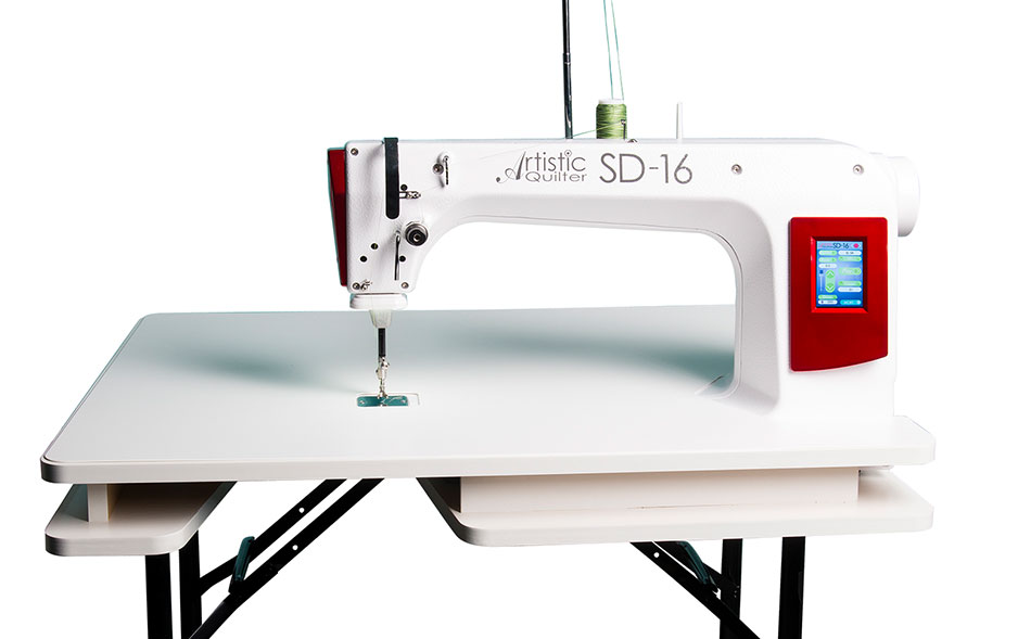 If you love free-motion quilting, the Artistic Quilter Sit Down 16″ will give you the freedom to accomplish any quilting project. With throat space of sixteen inches you have the room to work on quilts as big as king-size. The included table is easy to set up and take down. Adjust the height of the table from sitting to counter height and you are ready to begin quilting.