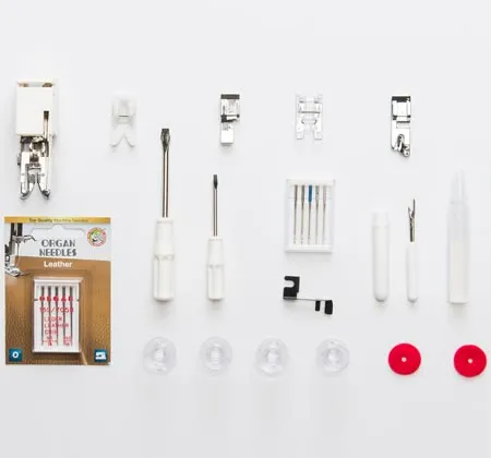 This Ultraglide Foot is molded from a special resin, allowing easier sewing of fabrics that may otherwise stick to the standard metal foot, such as leather, suede, vinyl, and plastic. The included 5-pack of Leather Needles can help make professional-looking leather projects. Use the Even Feed Foot for quilting or sewing multiple layers of fabric, a Hard Cover to store and transport your machine safely, plus Anna Maria Horner decals to decorate your machine and cover if you desire.