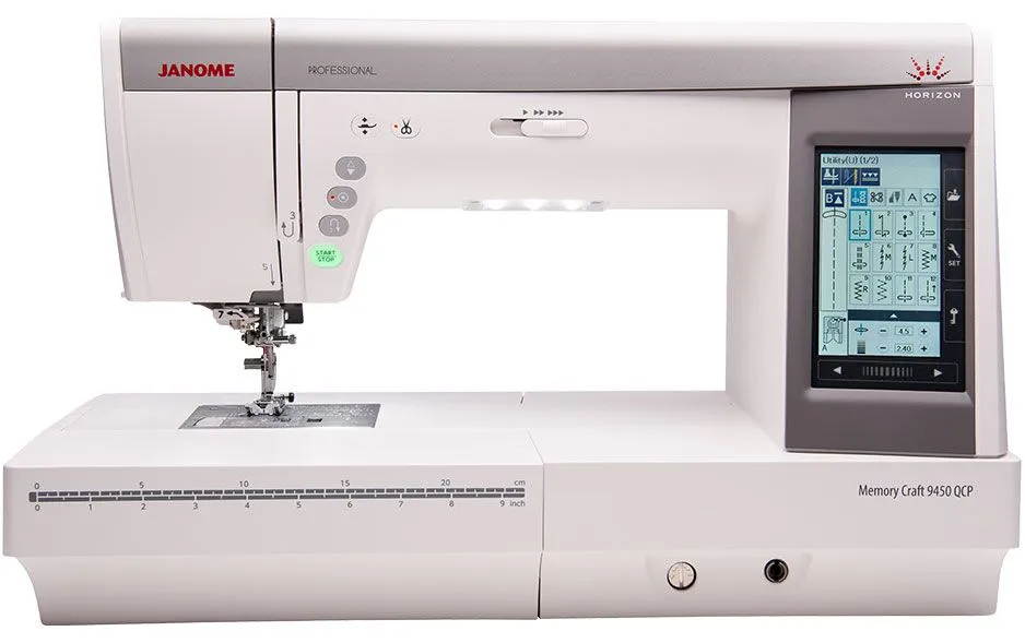 The Horizon Memory Craft 9450 QCP has all the features you require to simply sit, relax and sew. The large LCD color touch screen makes it so easy to navigate through the 350 built-in stitches, including 11 one-step buttonholes and 7 alpha numeric fonts including 9mm lettering and numbers. You can customize each stitch, including buttonholes, plus save as a favorite stitch. Sewing Applications gives you a variety of pre-set stitch functions, ready to sew zips, blind hem, buttons, quilting, rulerwork, patchwork and lots more.