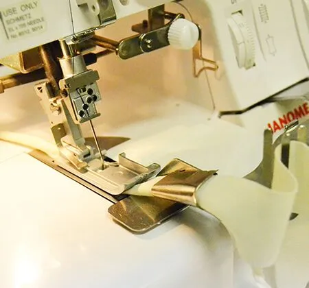 No need to pre-iron your bias strip; the tape binder automatically folds a 40 mm bias strip at the same time it is applied to the fabric edge. It is the perfect finish for blankets, placemats and jackets. The binding is secured with the Chainstitch. Use with a Piping Foot and Attachment Holder.