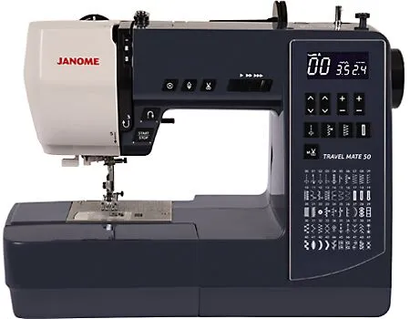 The Janome Travel Mate 50 computerized sewing machine offers a solid travel machine with a versatile stitch collection that will see you through most sewing tasks. A jam-proof top drop-in bobbin with 50 built-in stitches, plus an abundant selection of accessories, allows you to take on quilting, fashion, or craft sewing with ease and confidence. Hard Cover and Extension Table included… plus a Bonus Quilting Kit!