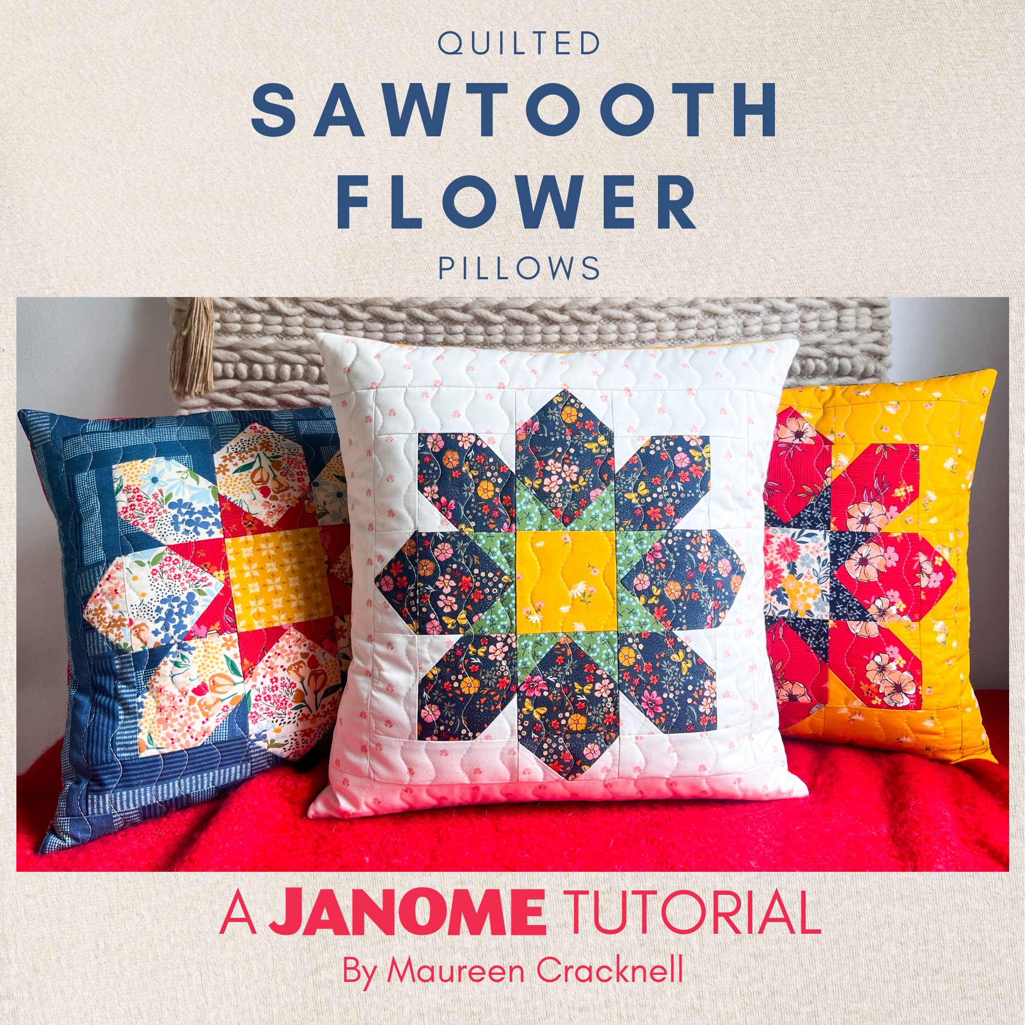 Inspired by my new floral fabric collection The Flower Fields, made using Janome’s amazing Continental M17, today’s tutorial is for these beautiful and fun Quilted Sawtooth Flower Pillows! The center of this pillow design is a standard 12.5 (unfinished) flower quilt block pattern that can be made over and over to make a quilt, that I finished into a 16″ cozy cushion made easy using the CM17’s large sewing area, built-in stitches, and incredible speed! Let’s get started!