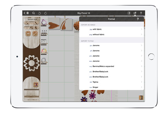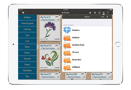 Import previously saved, edited or downloaded designs. Users can import designs by connecting to PC or MAC, or wirelessly via Dropbox or Airstash.